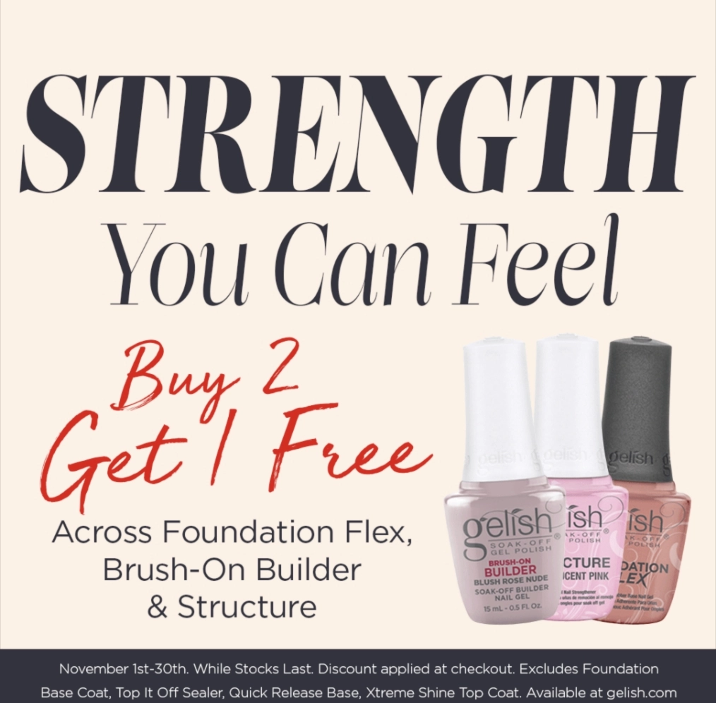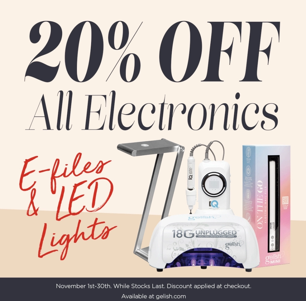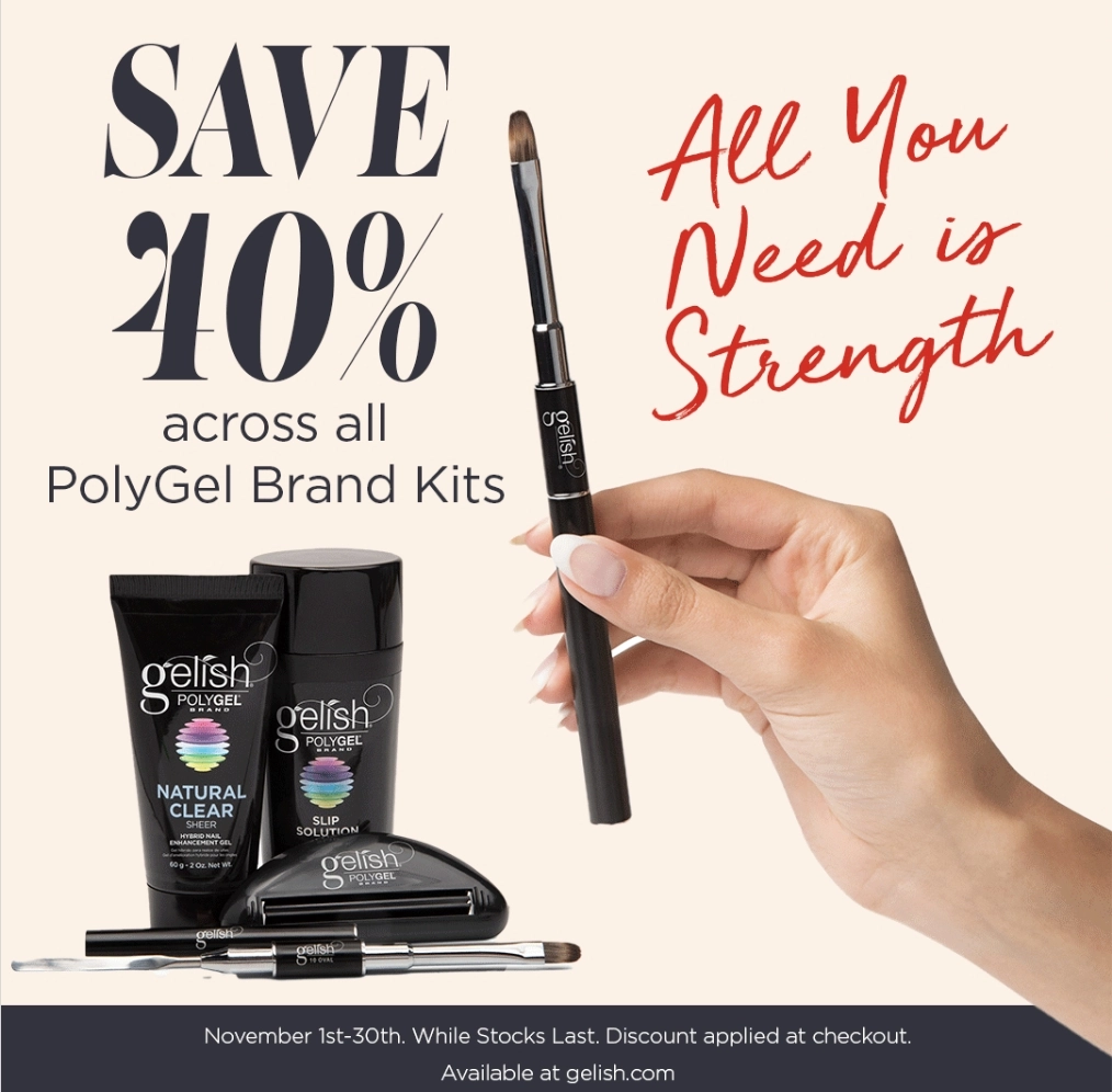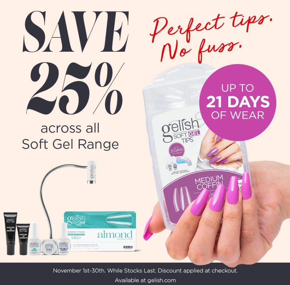 November 1st-30th. While Stocks Last. Discount applied at checkout. Available at gelish.com