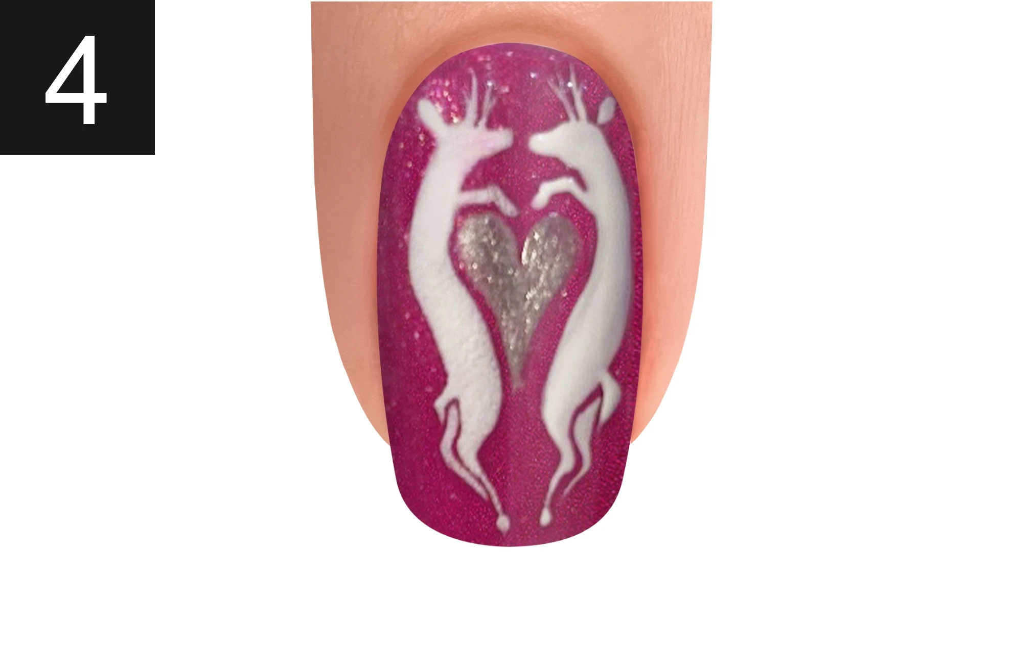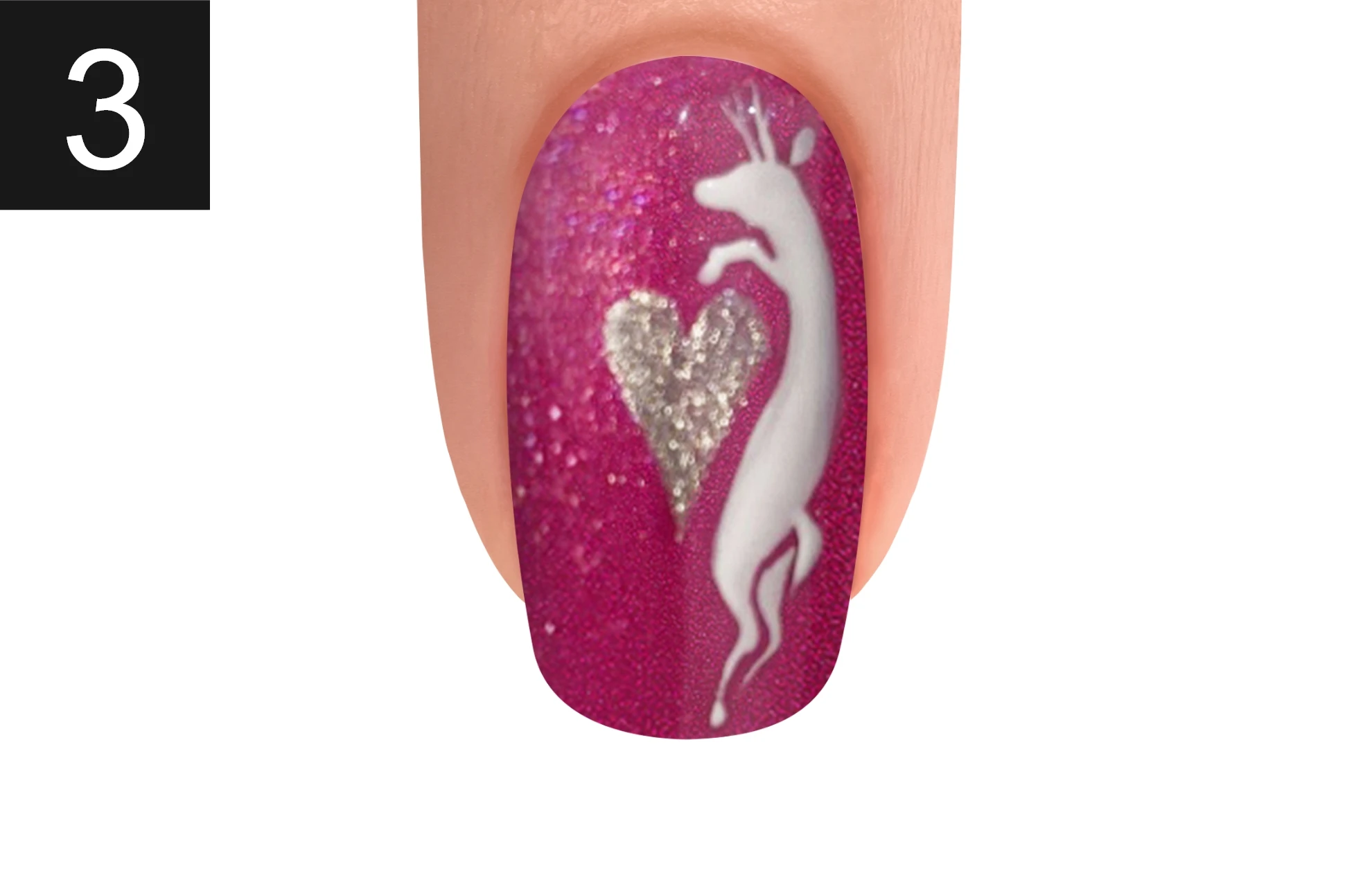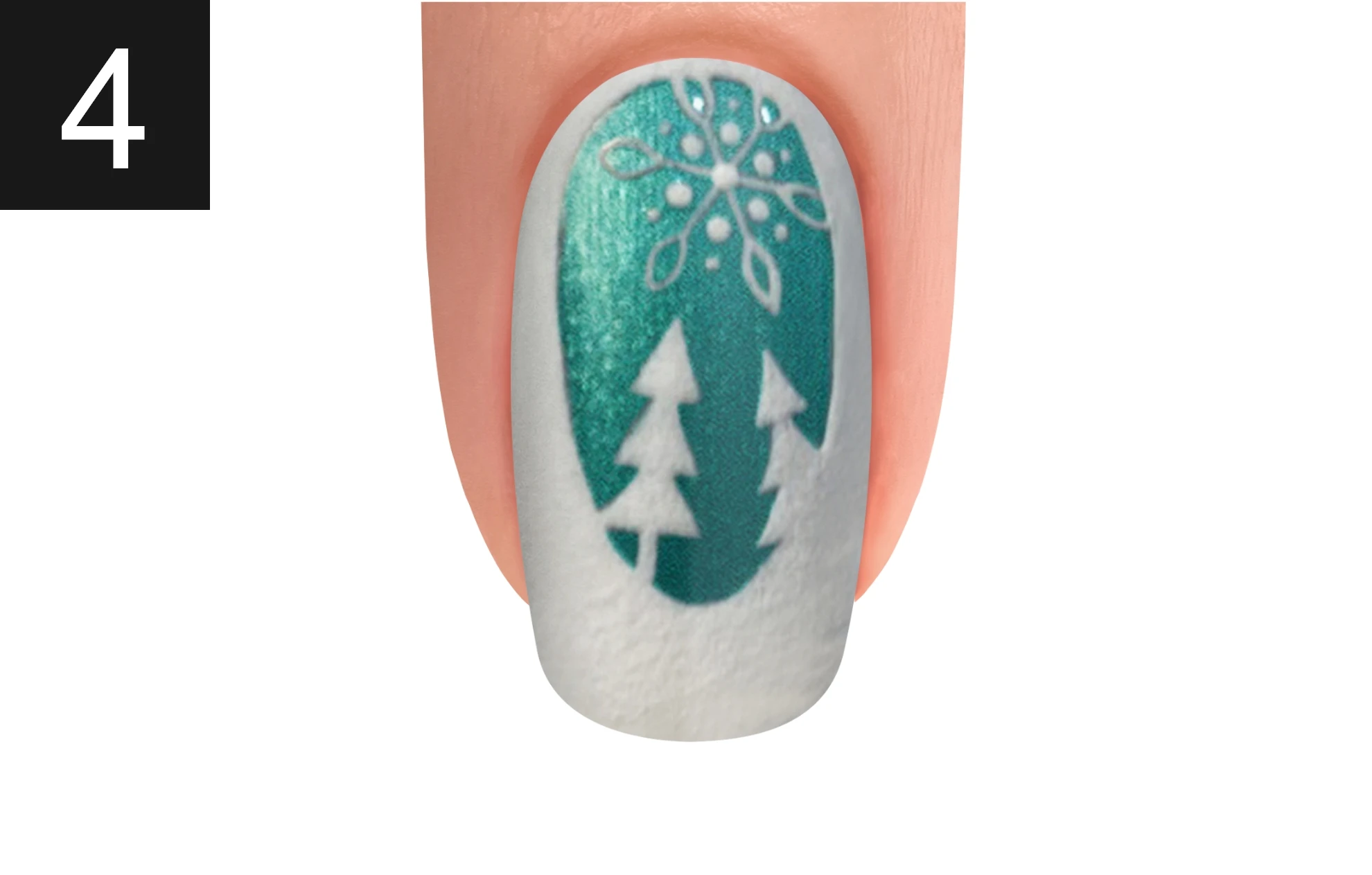 Create the second reindeer with Arctic Freeze and sprinkle XPRESS DIP N BRUSH ARCTIC FREEZE. Cure for 30 seconds and dust off any excess powder. Finish your look by massaging NOURISH Cuticle Oil into the skin surrounding the nail plate.