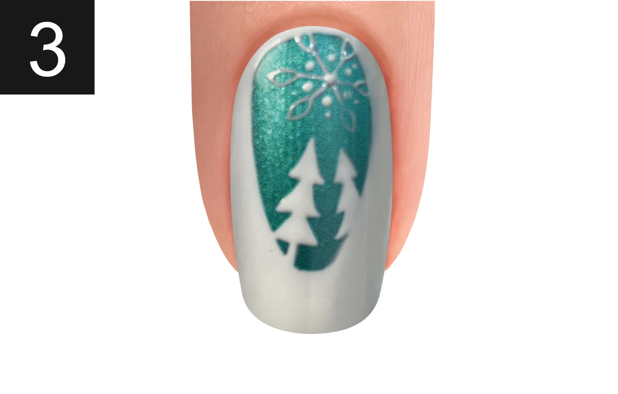 Paint a snowflake and two trees using Arctic Freeze. Do not cure.