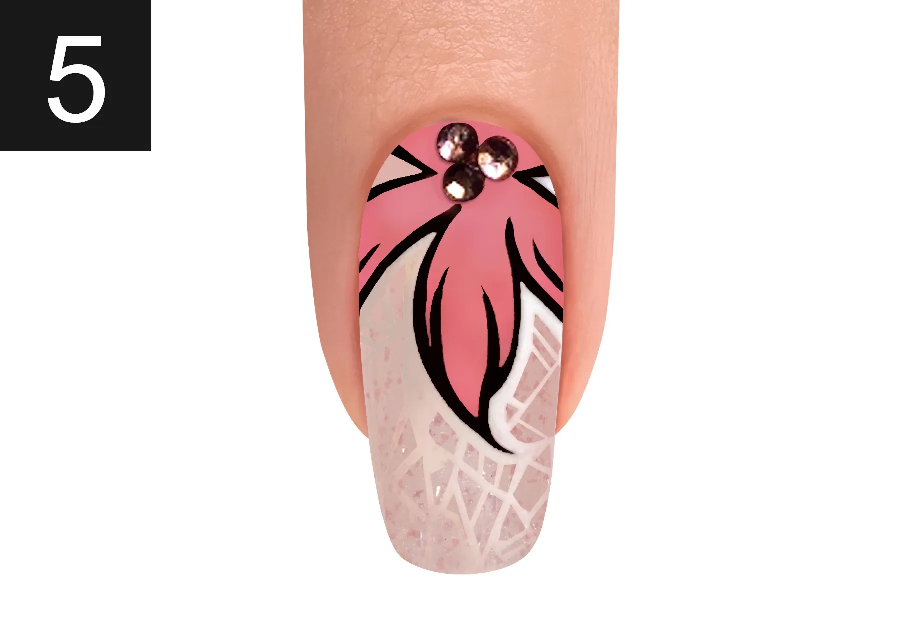 Using ARCTIC FREEZE and a Mini Striper Brush, create pattern. Cure for 30 seconds. Adhere rhinestones. Apply TOP IT OFF