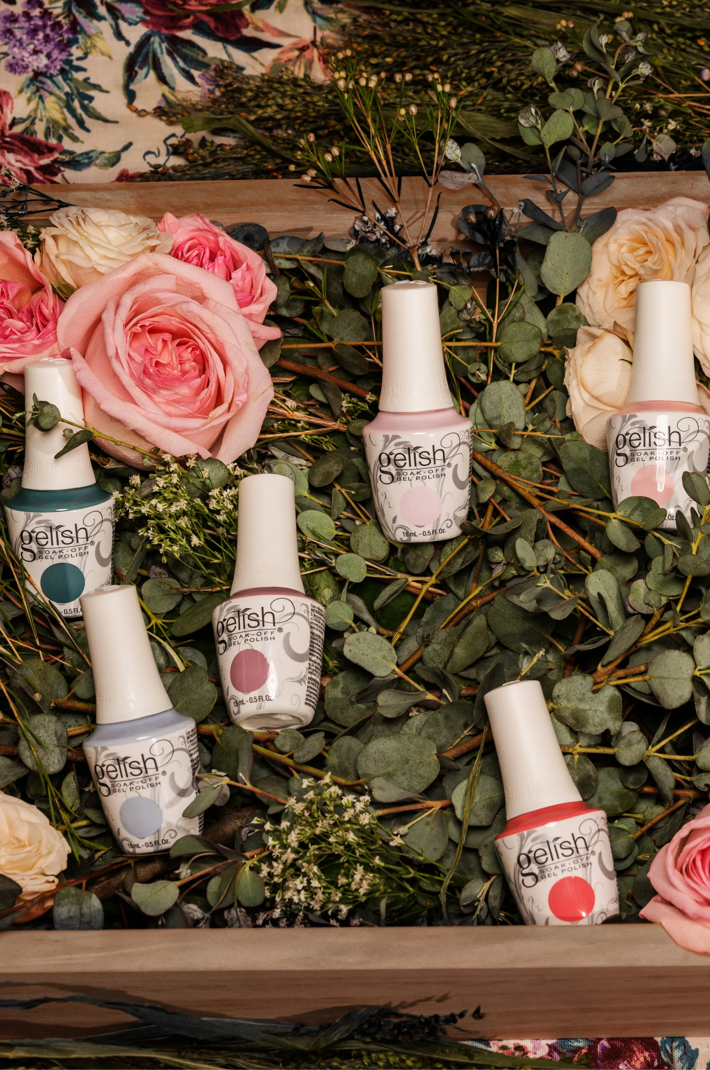 The collection offers a bouquet of eye-catching cremes plus a delicate glitter that may be worn on its own or as an overcoat.
