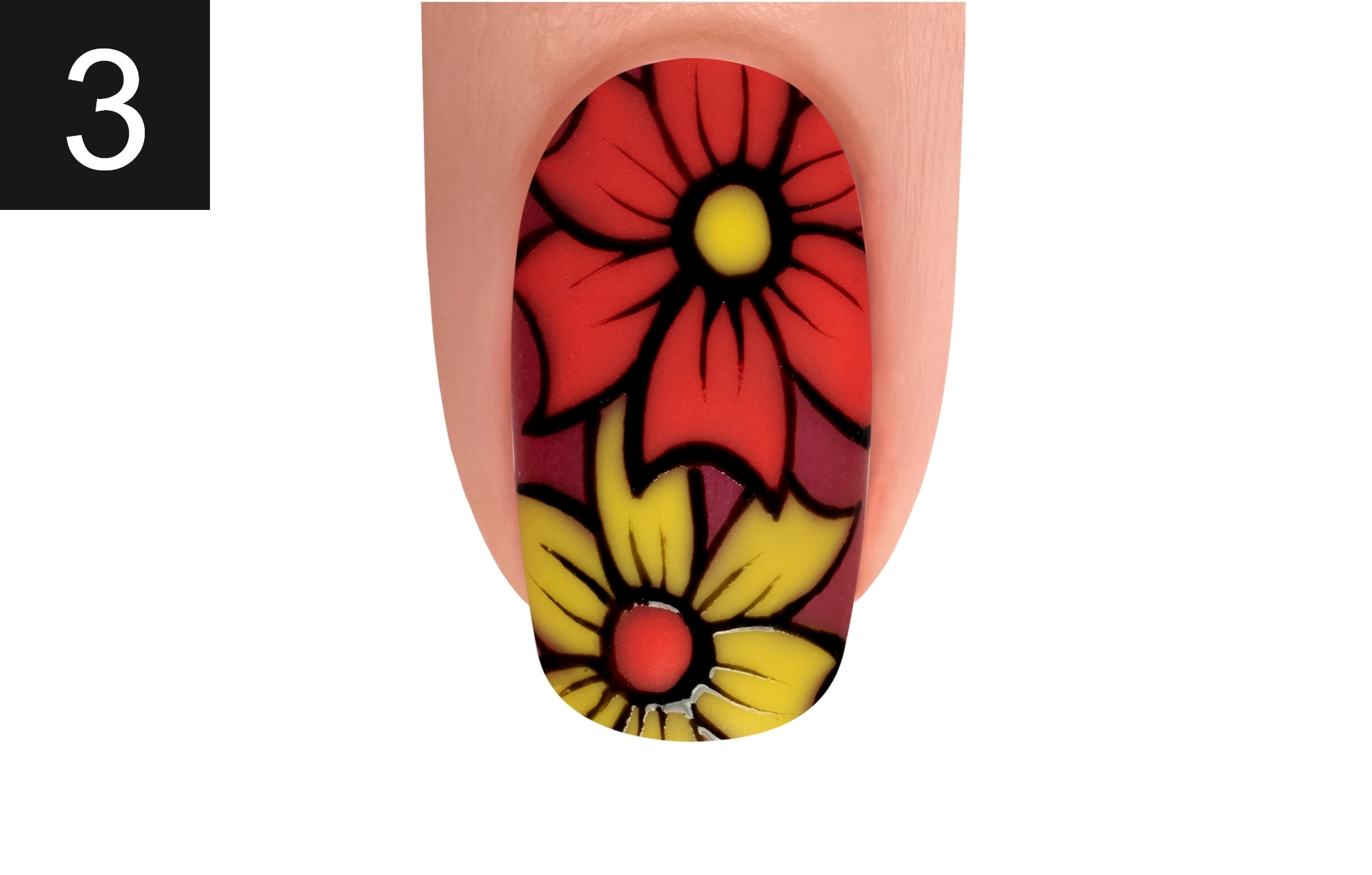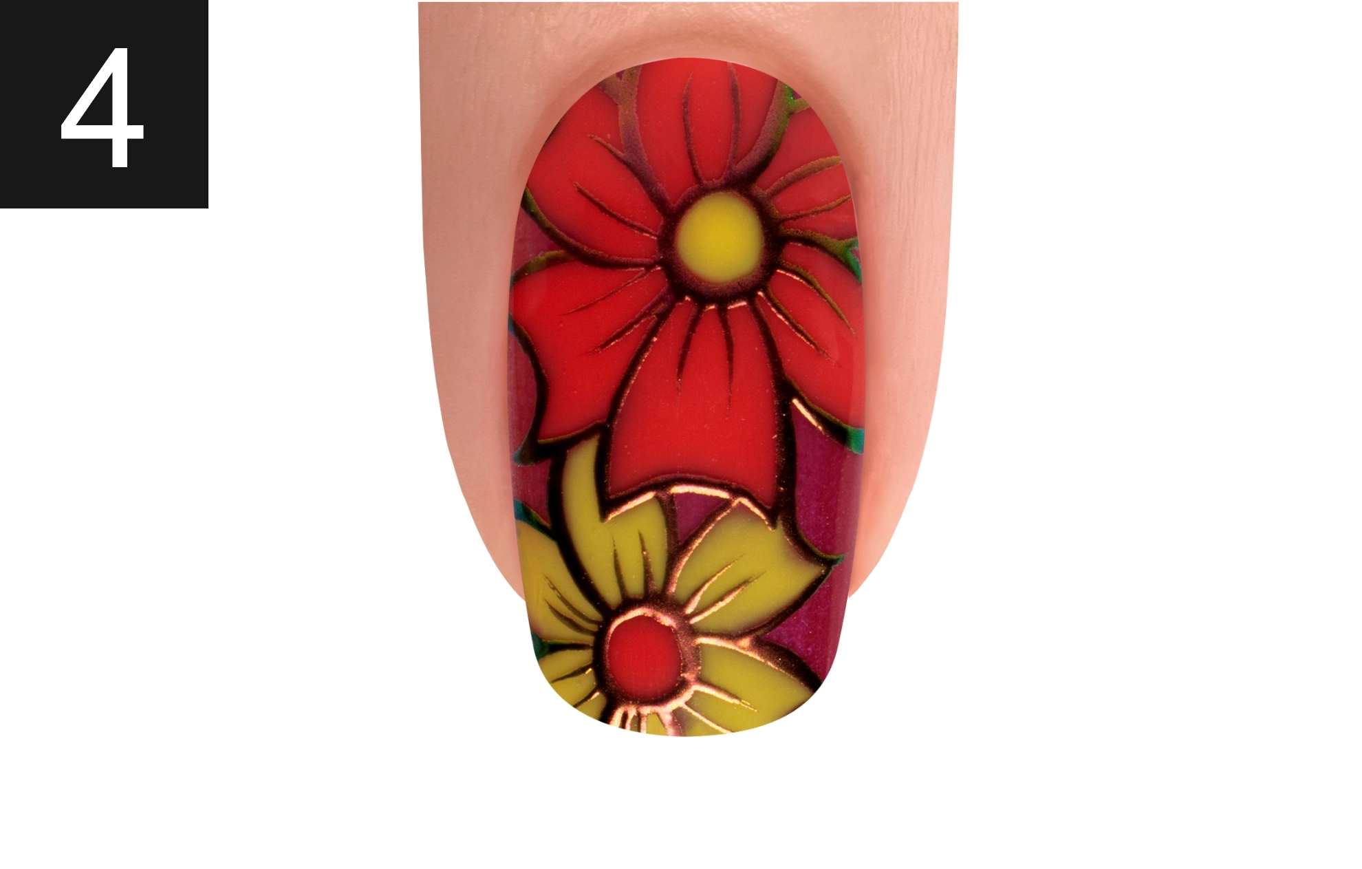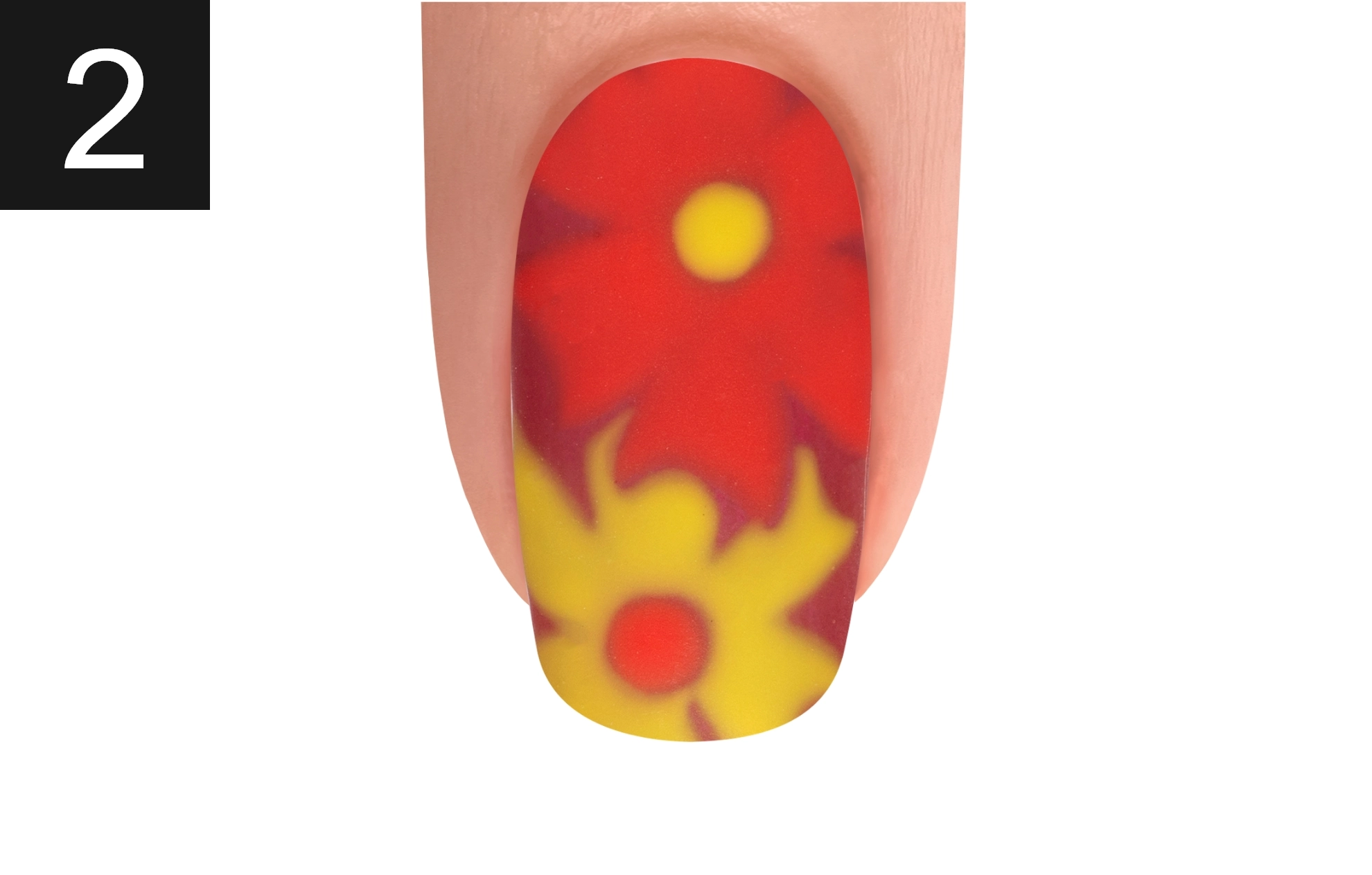 Create flowers with PERK UP BUTTERCUP and I’M ALL CHEERS. Cure for 30 seconds. Apply MATTE TOP IT OFF and cure for 30 seconds. With NAIL SURFACE CLEANSE and WIPE IT OFF lint-free wipes, cleanse the inhibition layer of the nail.