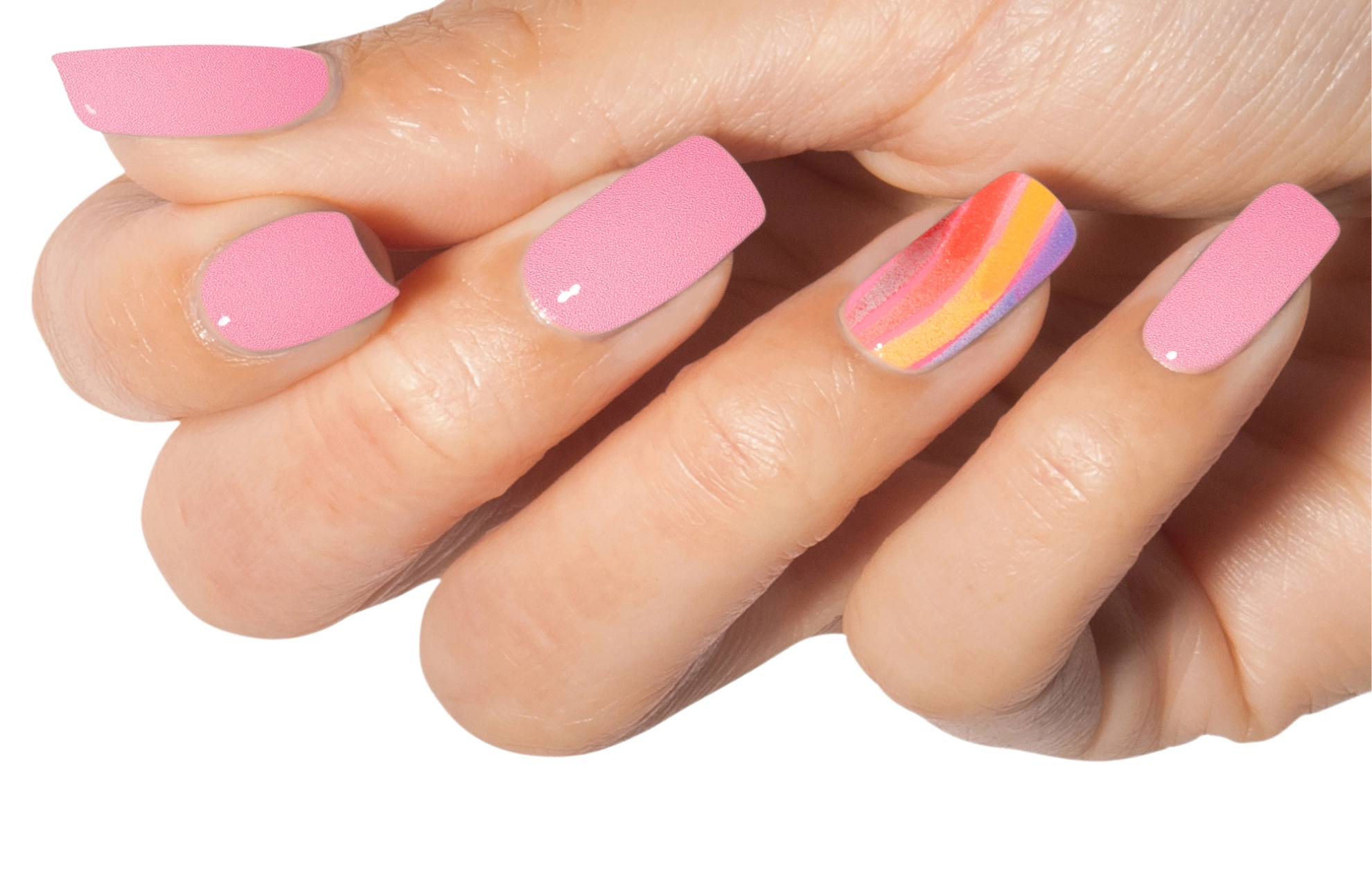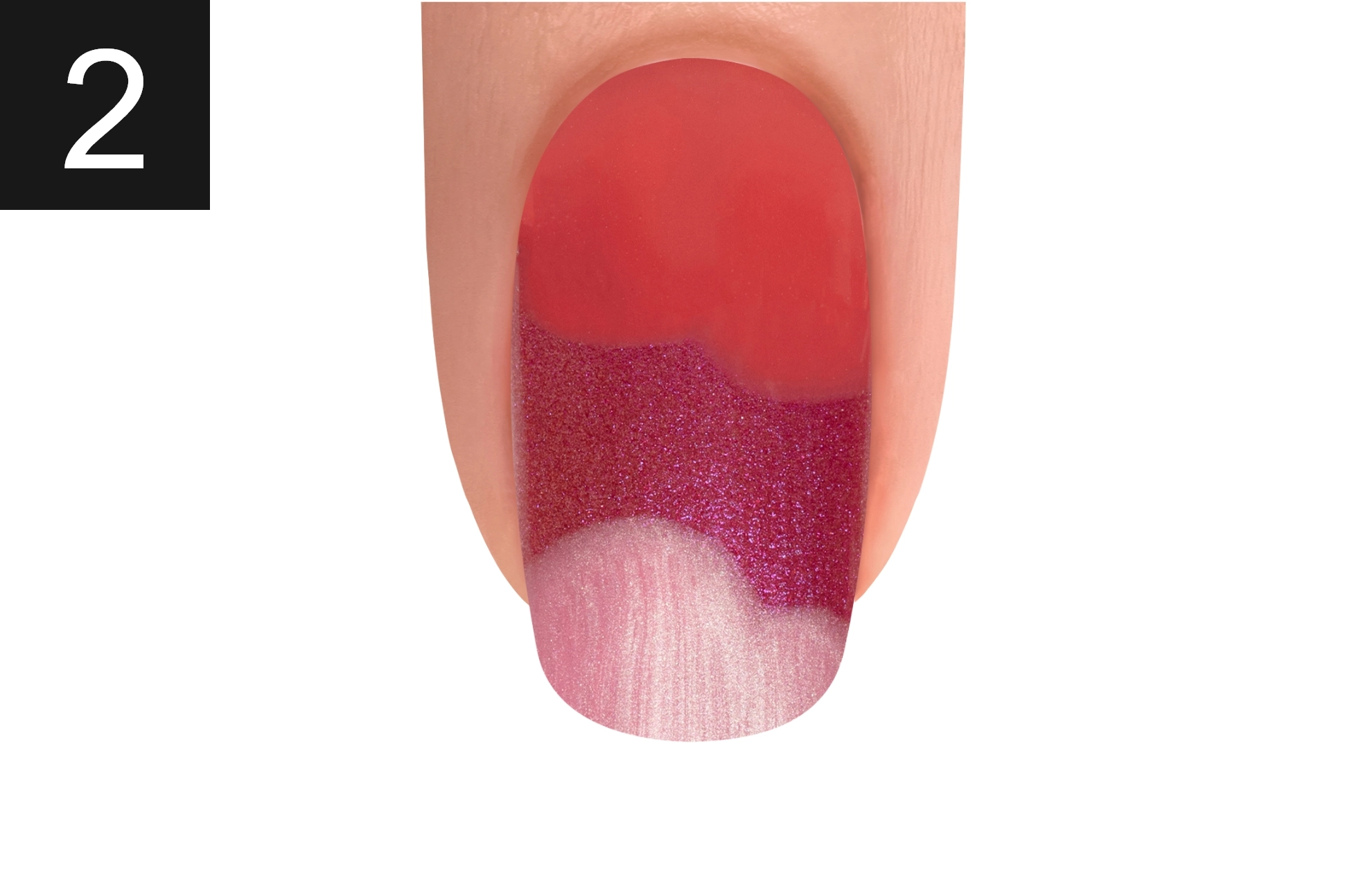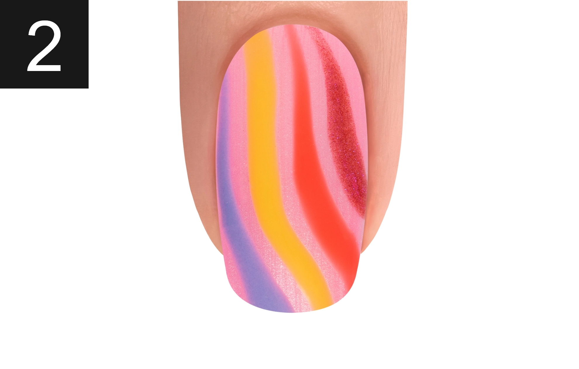 Apply HUGS & BLISSES and I’M ALL CHEERS onto the nail and cure for 30 seconds. Apply NO CLEANSE TOP COAT to the entire nail making sure to cap the free edge