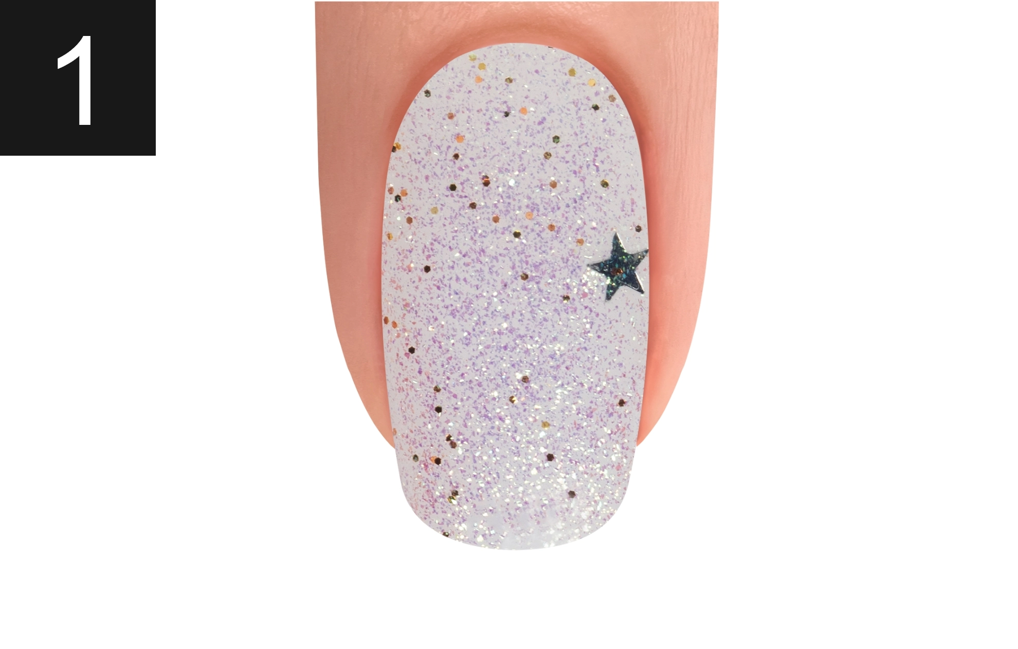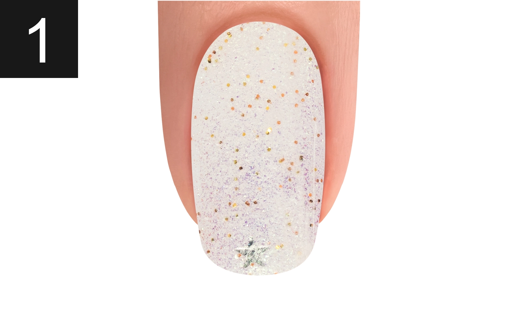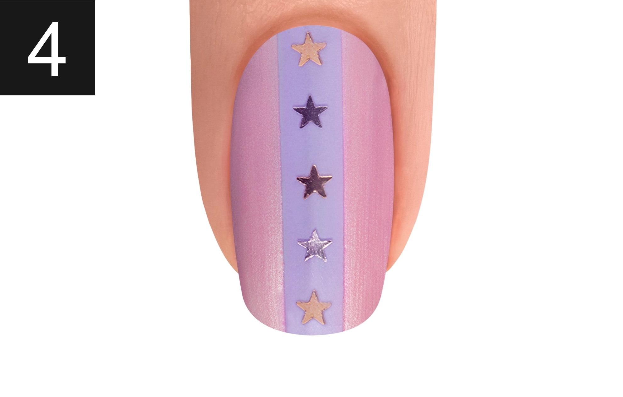 Apply STAR WALKING, CAN’T BURST MY BUBBLE, PERK UP BUTTERCUP, I’M ALL CHEERS and SIPPING ON SERENITY onto the nail.
