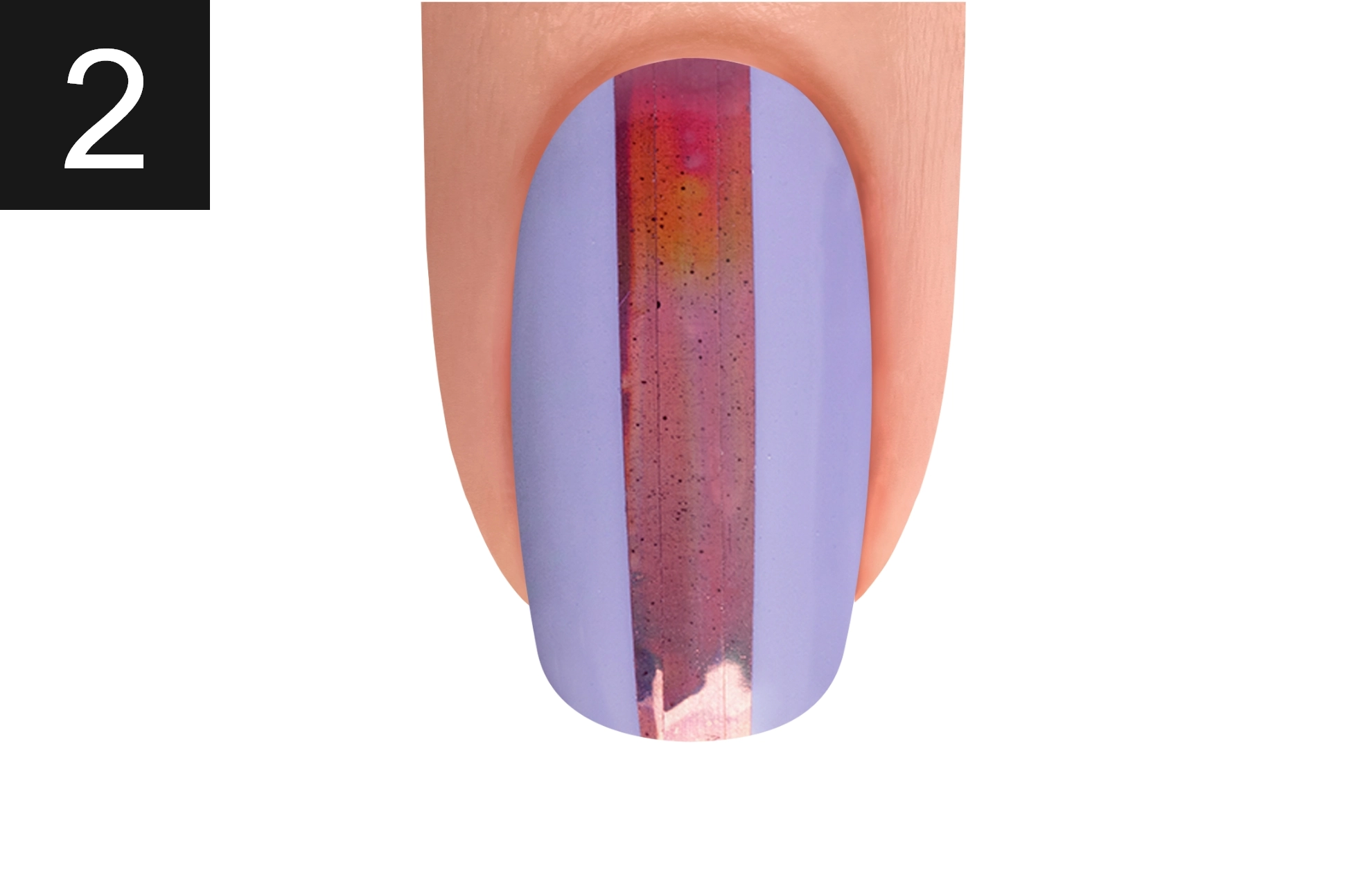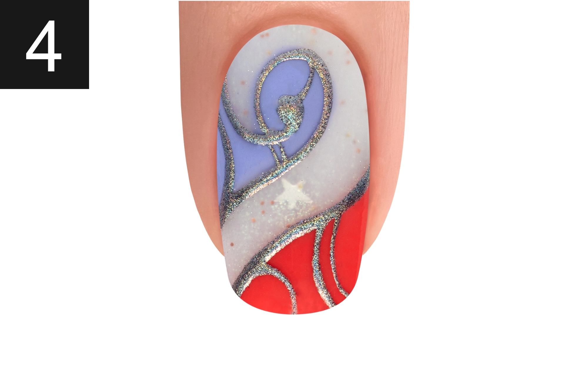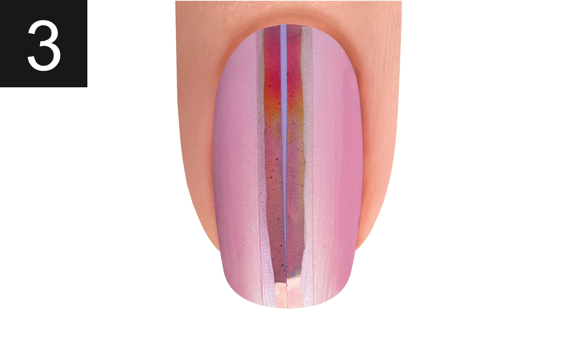 Apply CHROME STIX SILVER HOLOGRAPHIC and NO CLEANSE TOP COAT. Cure for 60 seconds.