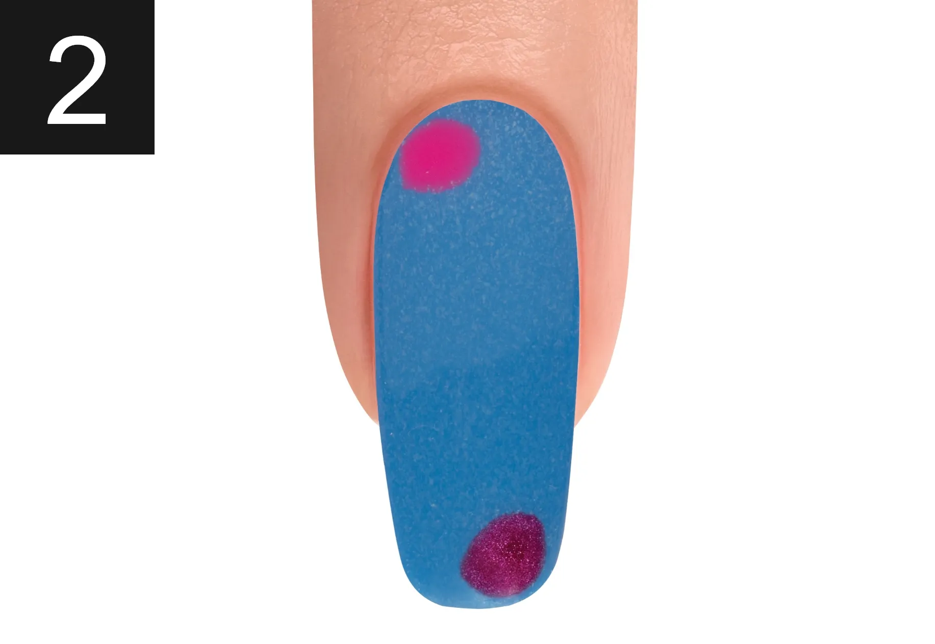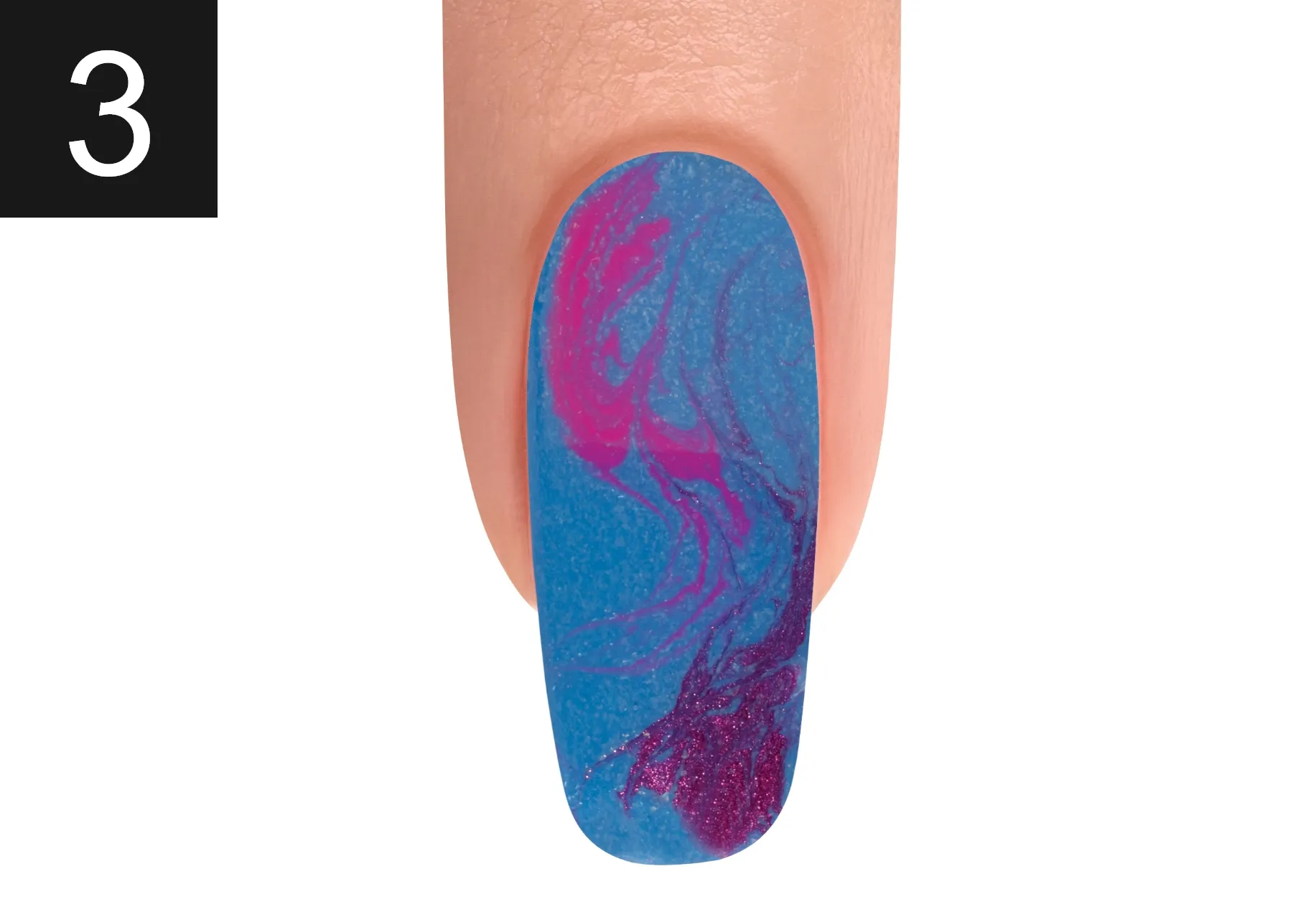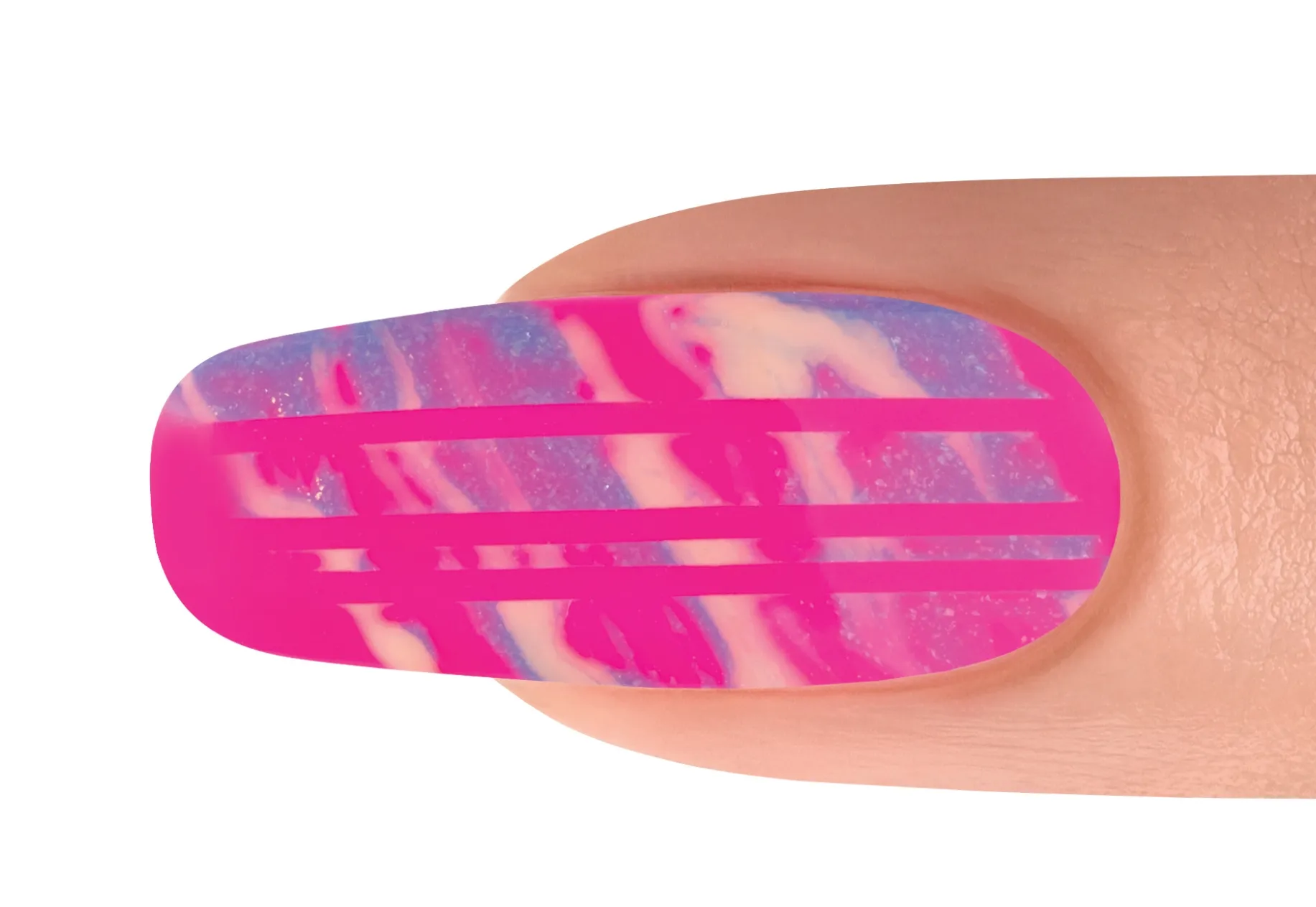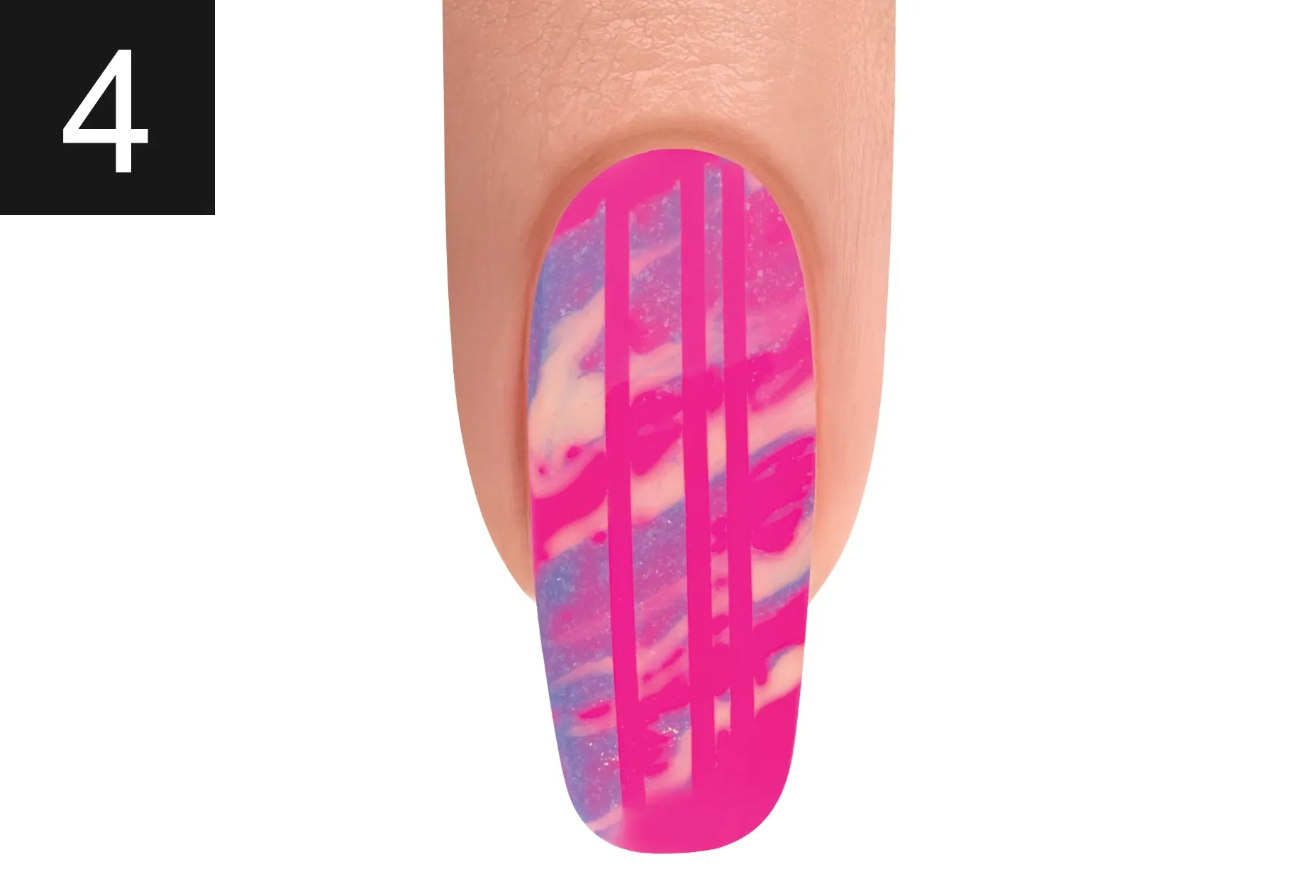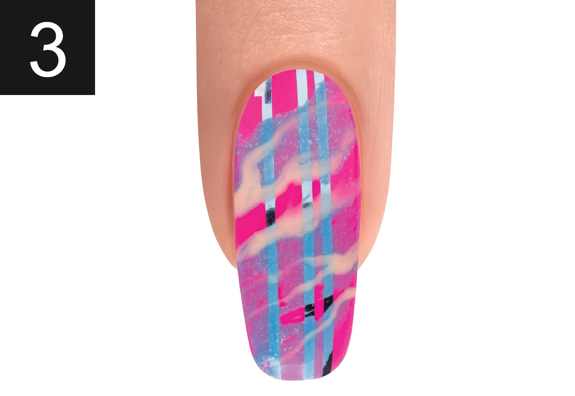 With a Mini Striper Brush, apply It’s My Moment and ALL DAY, ALL NIGHT, swirl the colors together. Cure for 30 seconds.