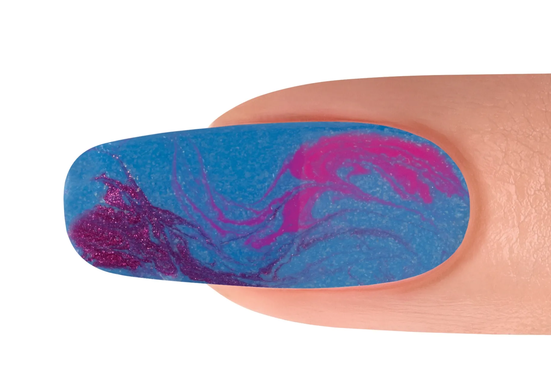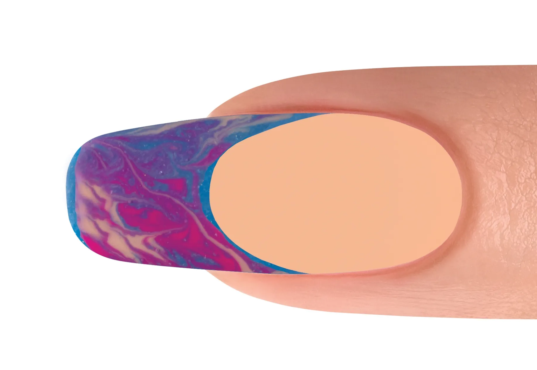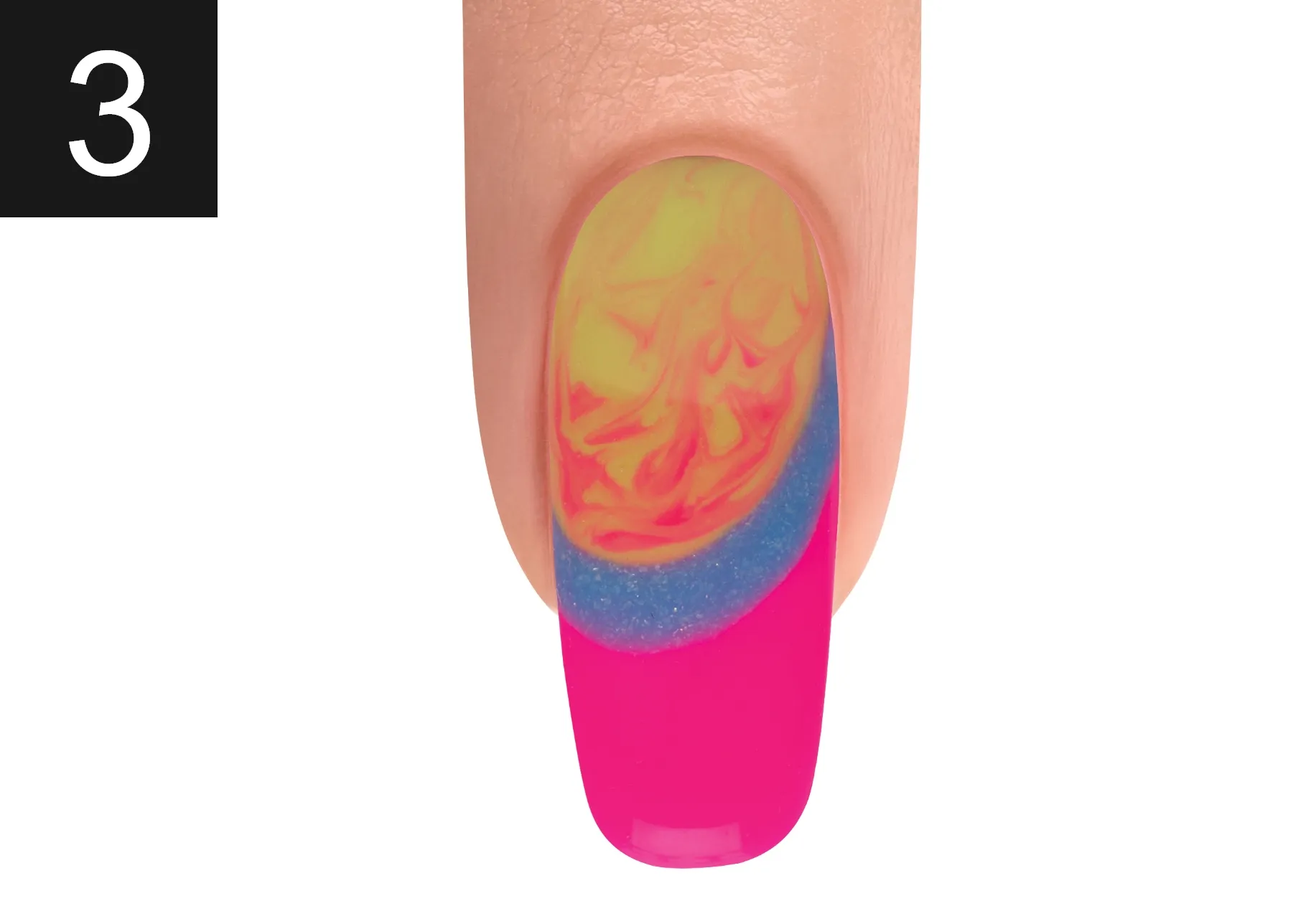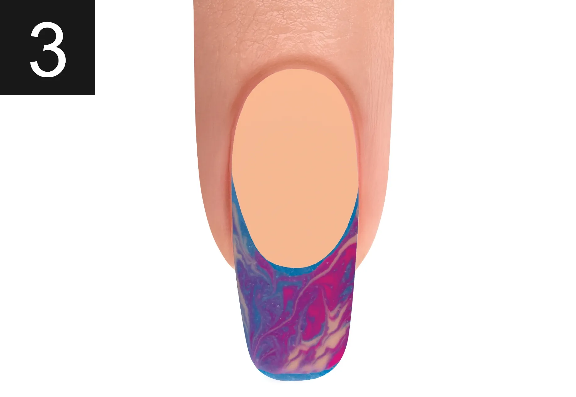 With a Mini Striper Brush, swirl the colors together. Cure for 30 seconds. Apply TOP IT OFF to the entire nail making sure to cap the free edge. Cure for 30 Seconds.