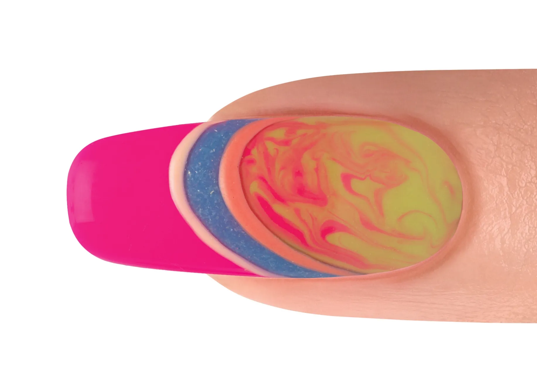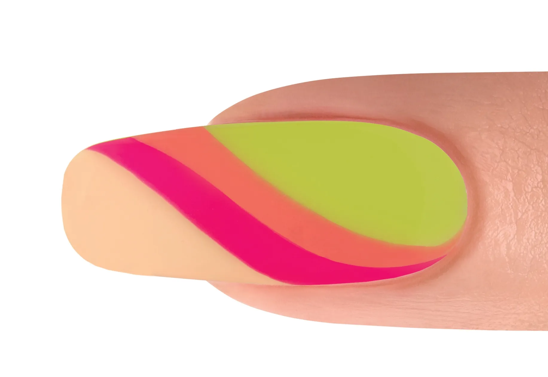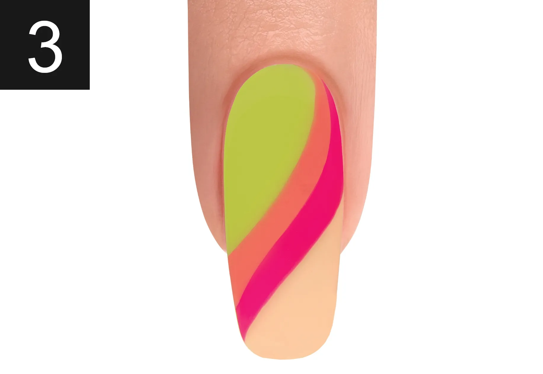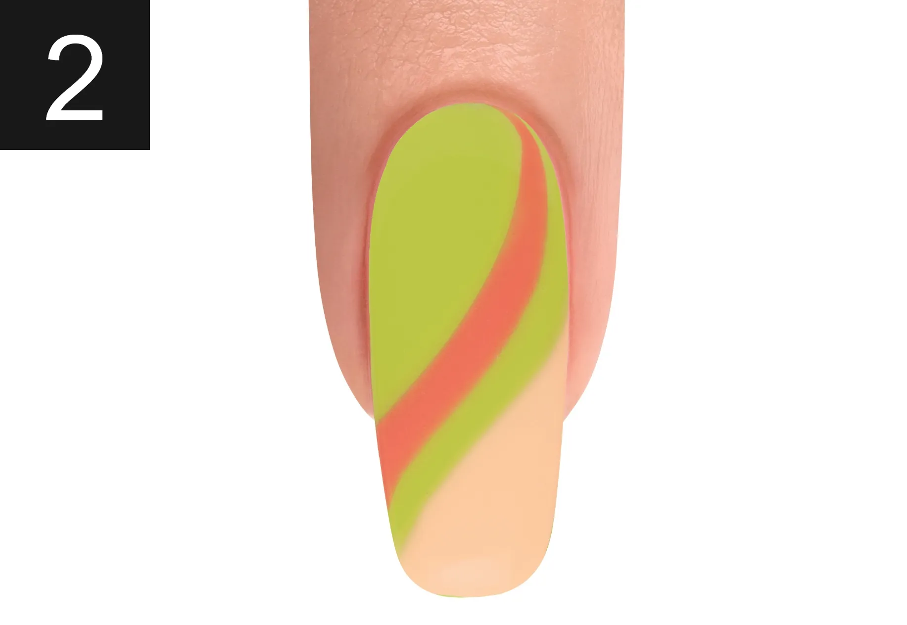 With a Mini Striper Brush, apply curved lines of IT’S MY MOMENT and ORANGE CRUSH BLUSH. Cure for 30 seconds. Apply TOP IT OFF to the entire nail making sure to cap the free edge. Cure for 30 seconds. Apply INTO THE LIME-LIGHT and ALL DAY, ALL NIGHT onto the nail. Swirl the two colors together and cure for 30 seconds.