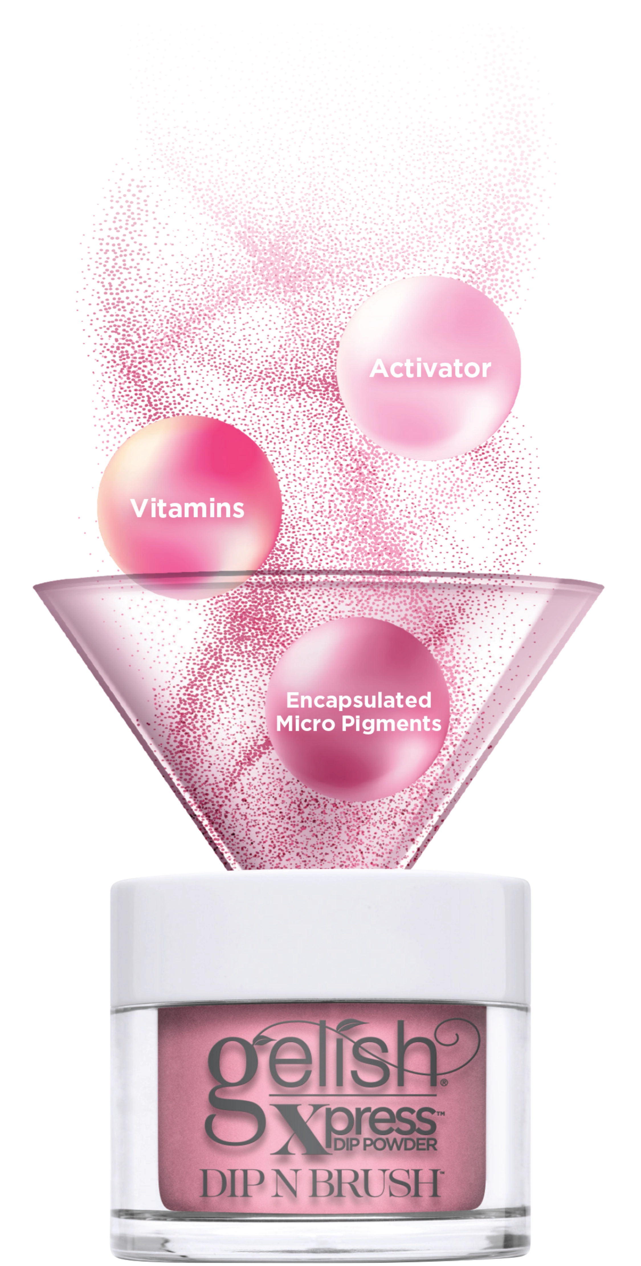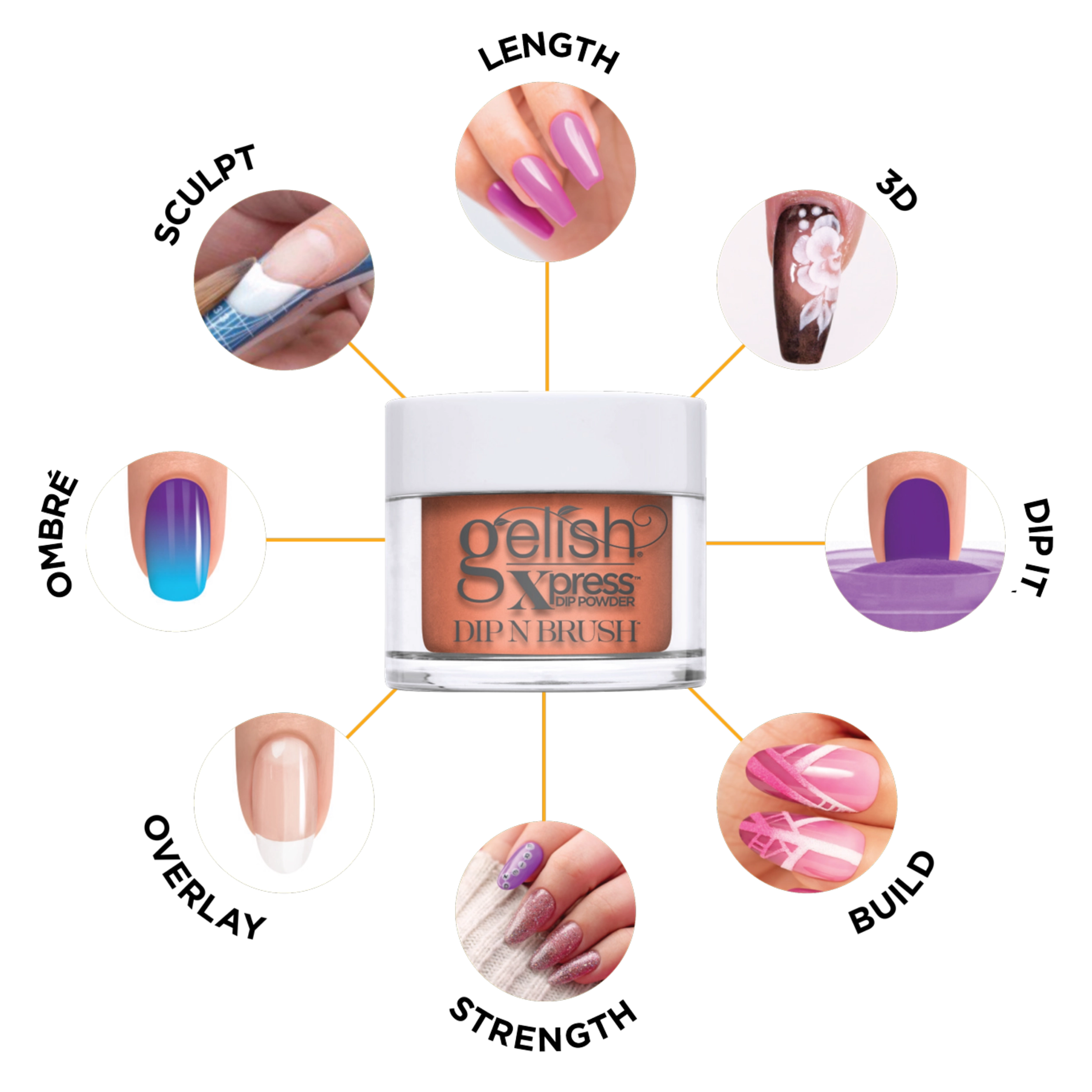 Gelish® Xpress™ Dip N Brush Activated Color Powders are uniquely formulated to control resin absorption and prevent brushes from hardening. Clumping powders and uneven color are also a thing of the past! The Controlled Fusion Process also delivers consistent color coverage for less finish filing, while reducing product brittleness for longer-lasting, chip-proof wear.