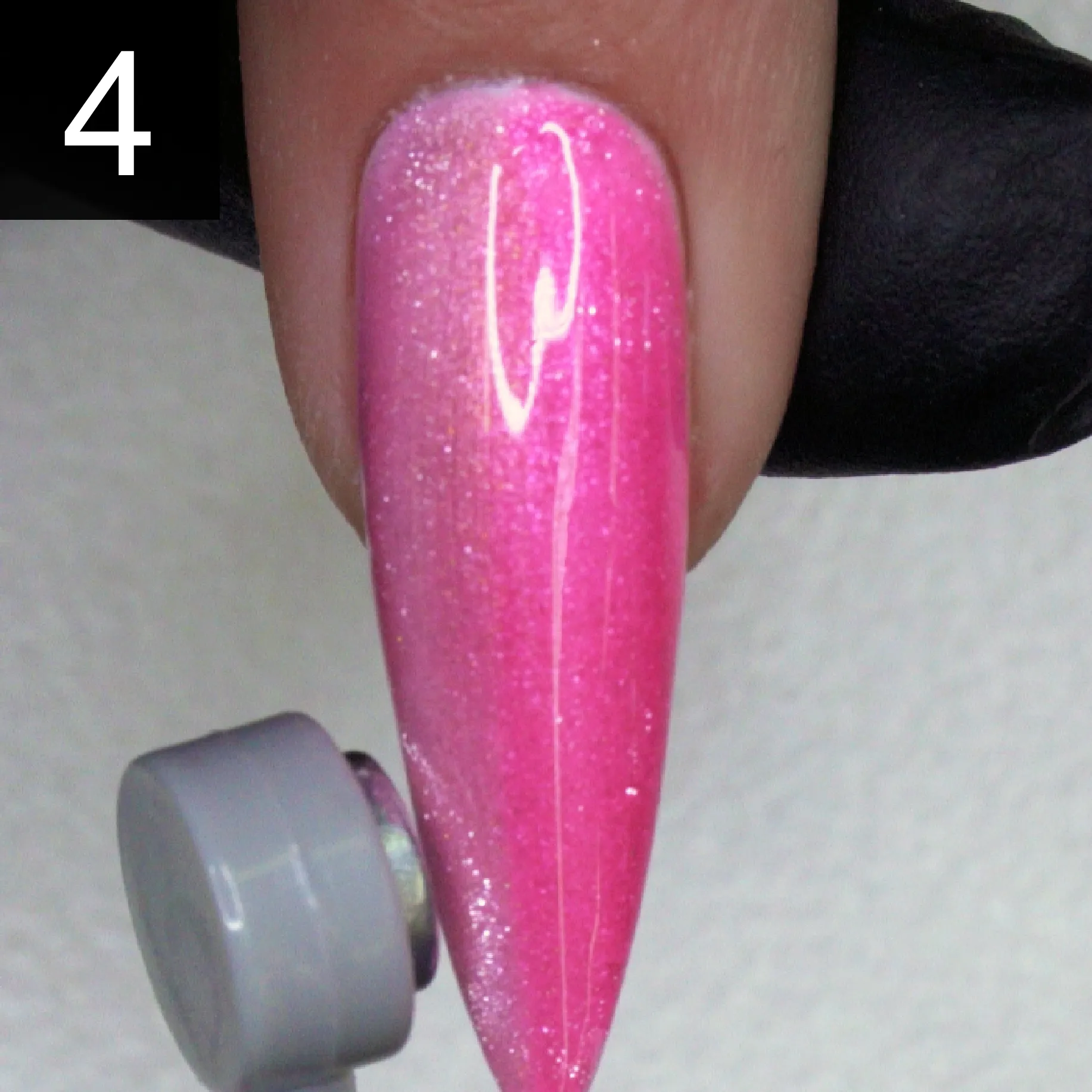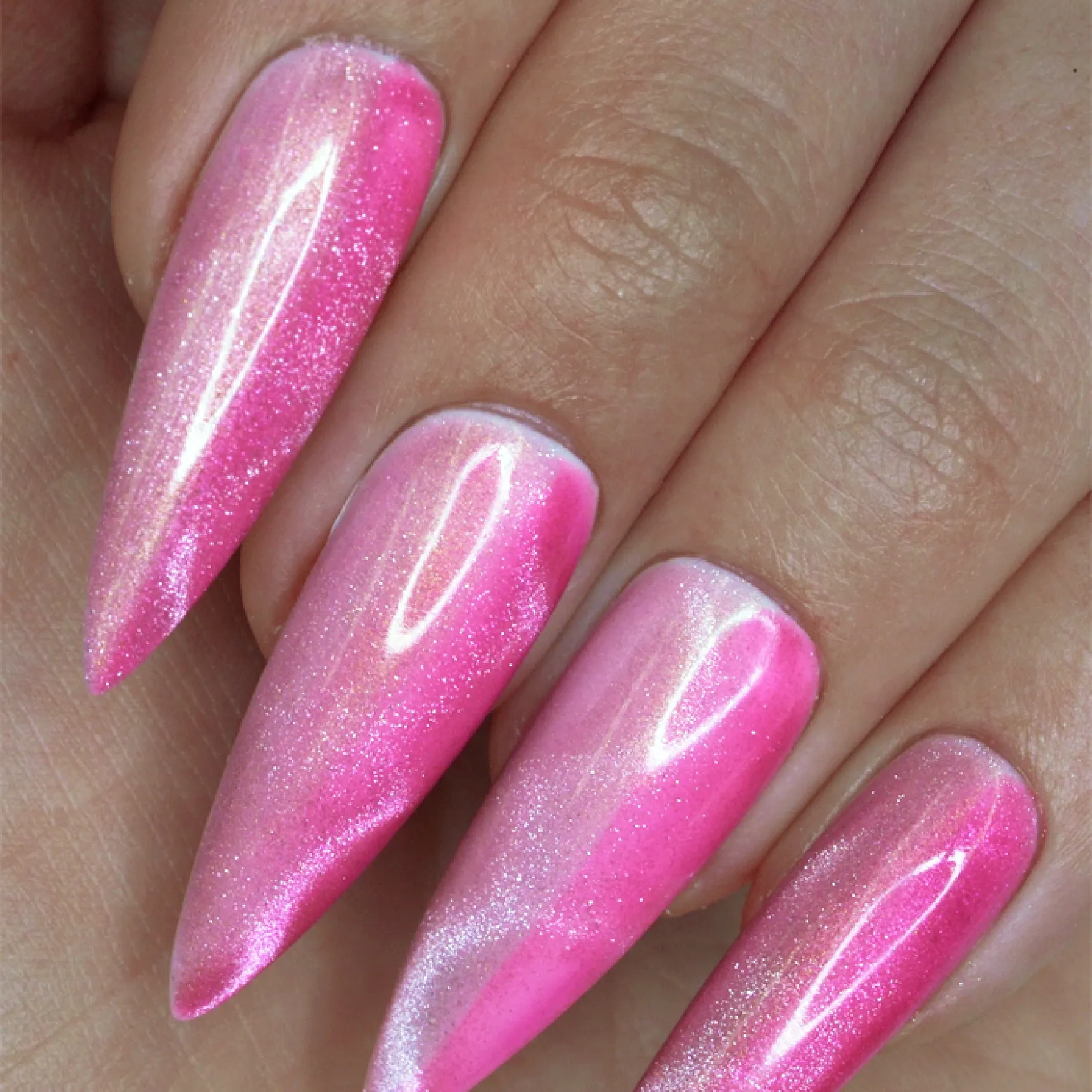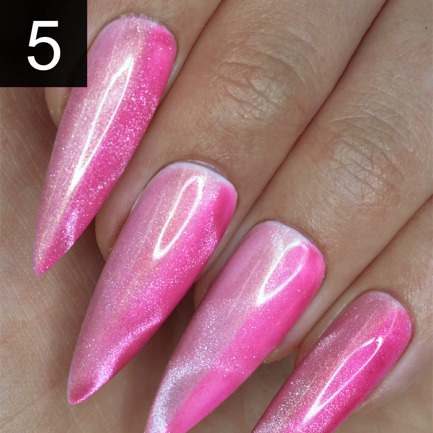 Cat Eye Magnetic Reflections Gels have a shimmering reflective effect with a two-toned color shift. These new cat eye gel polishes have been formulated to be used on top of traditional gel polish colors, with dark shades like black giving them the most pop. Simply apply one layer over your gel polish, magnetize to get the design of your choosing, and then cure to lock in the magic!