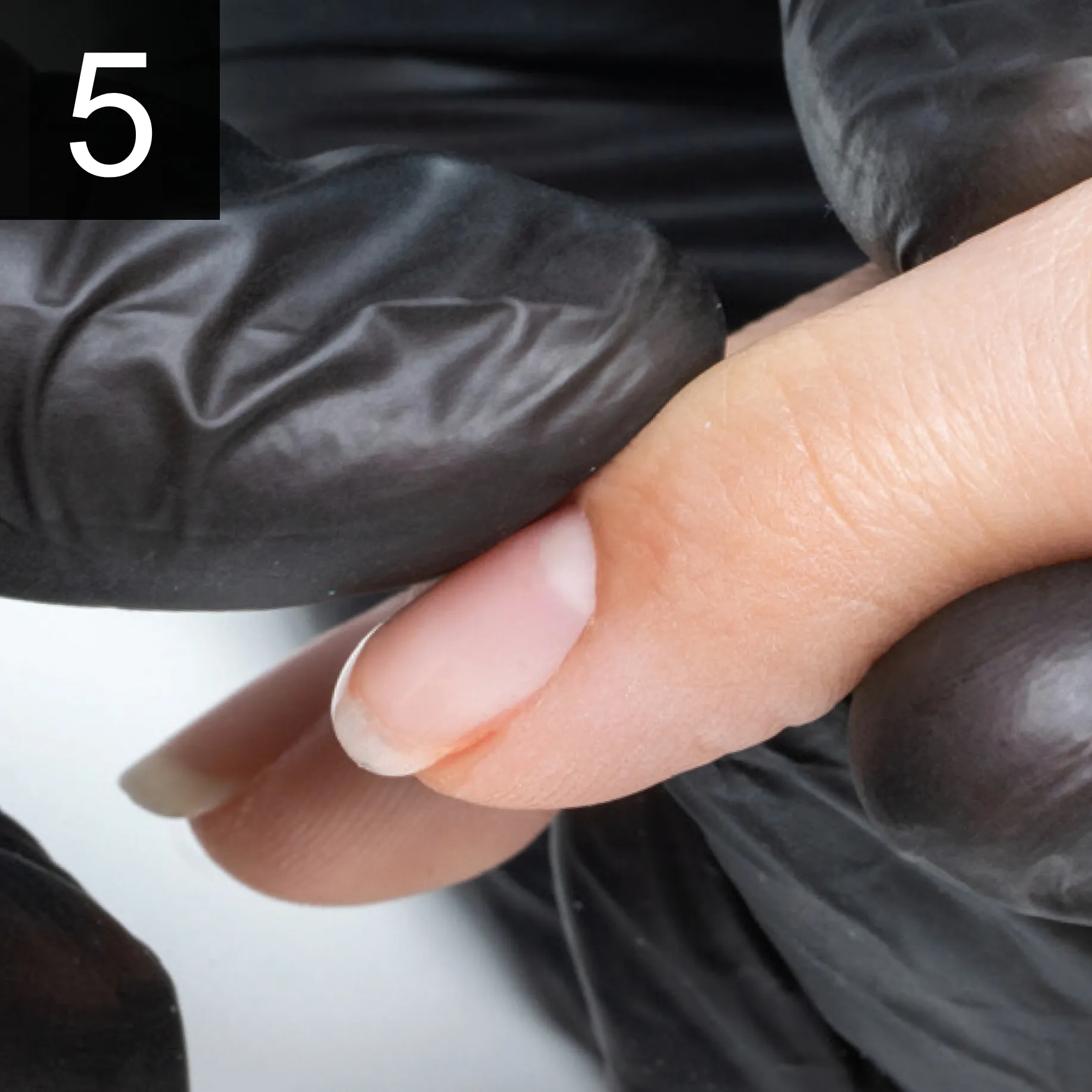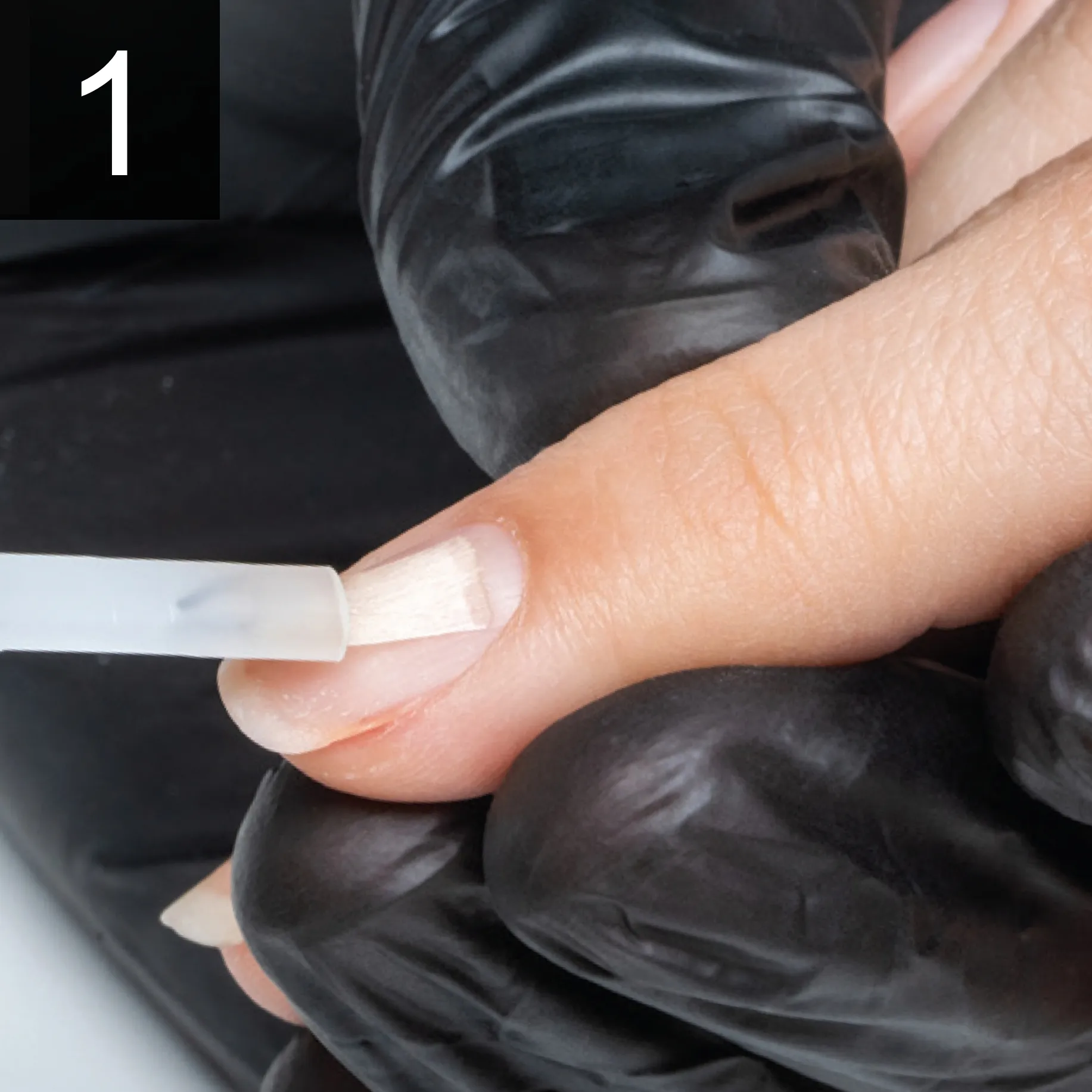 With NAIL SURFACE CLEANSE and WIPE IT OFF lint-free wipes, cleanse the inhibition layer of the nail. Using a 150 or 180 File, shape the nail and cleanse using Nail Surface Cleanse and a Wipe It Off lintfree nail wipe.