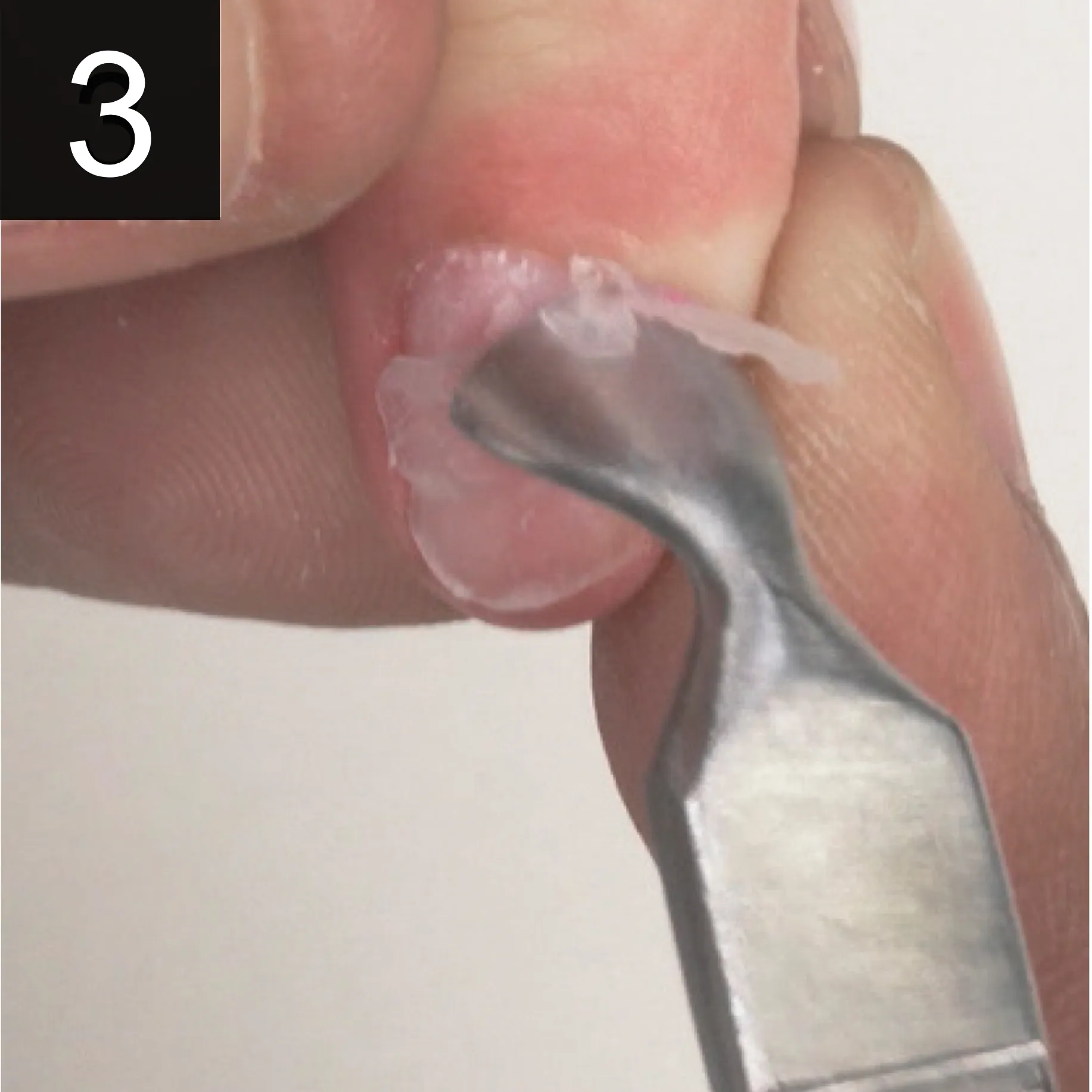 Sanitize your client’s hands and nails. Push back the eponychium and clean the nail plate of excess cuticle.